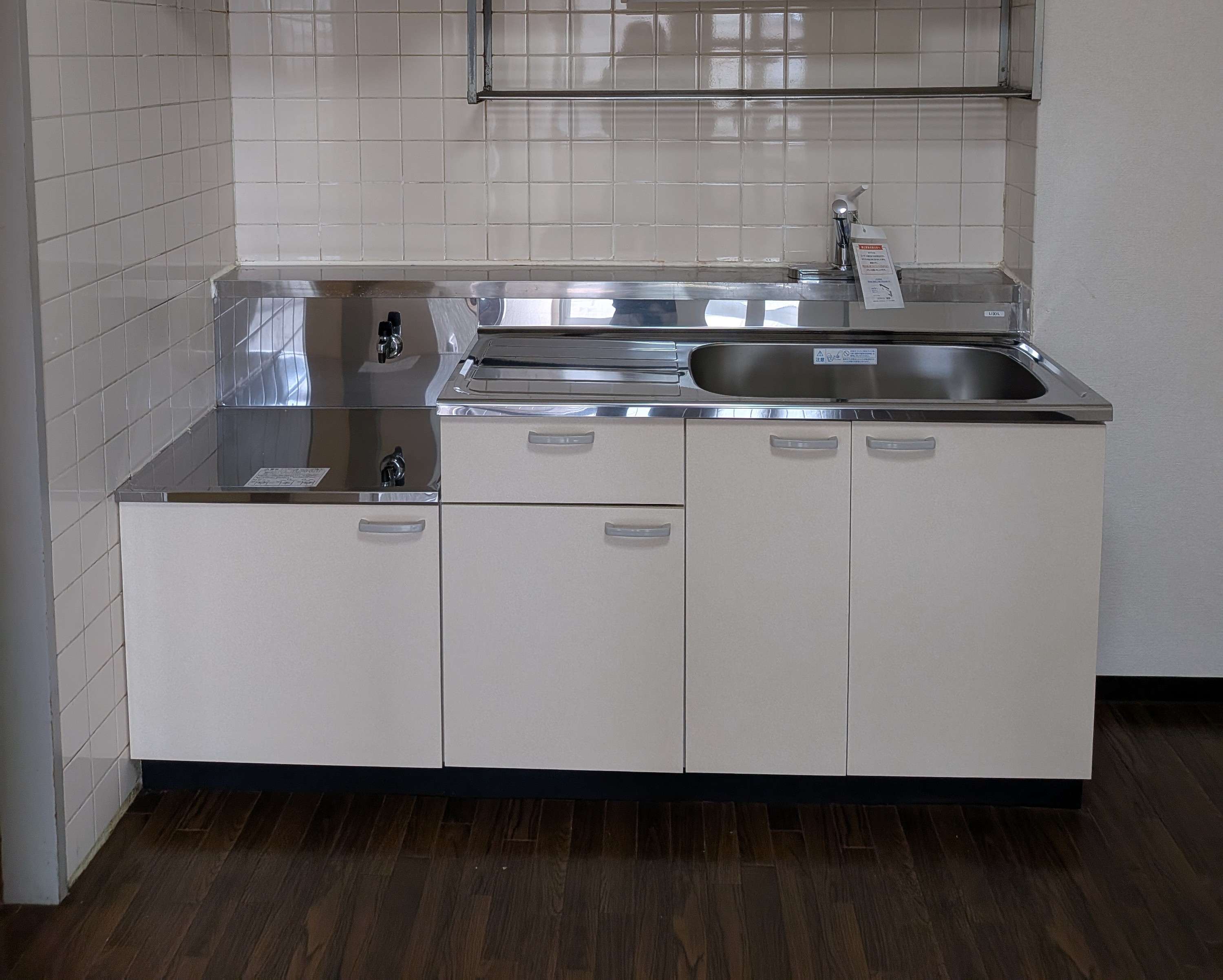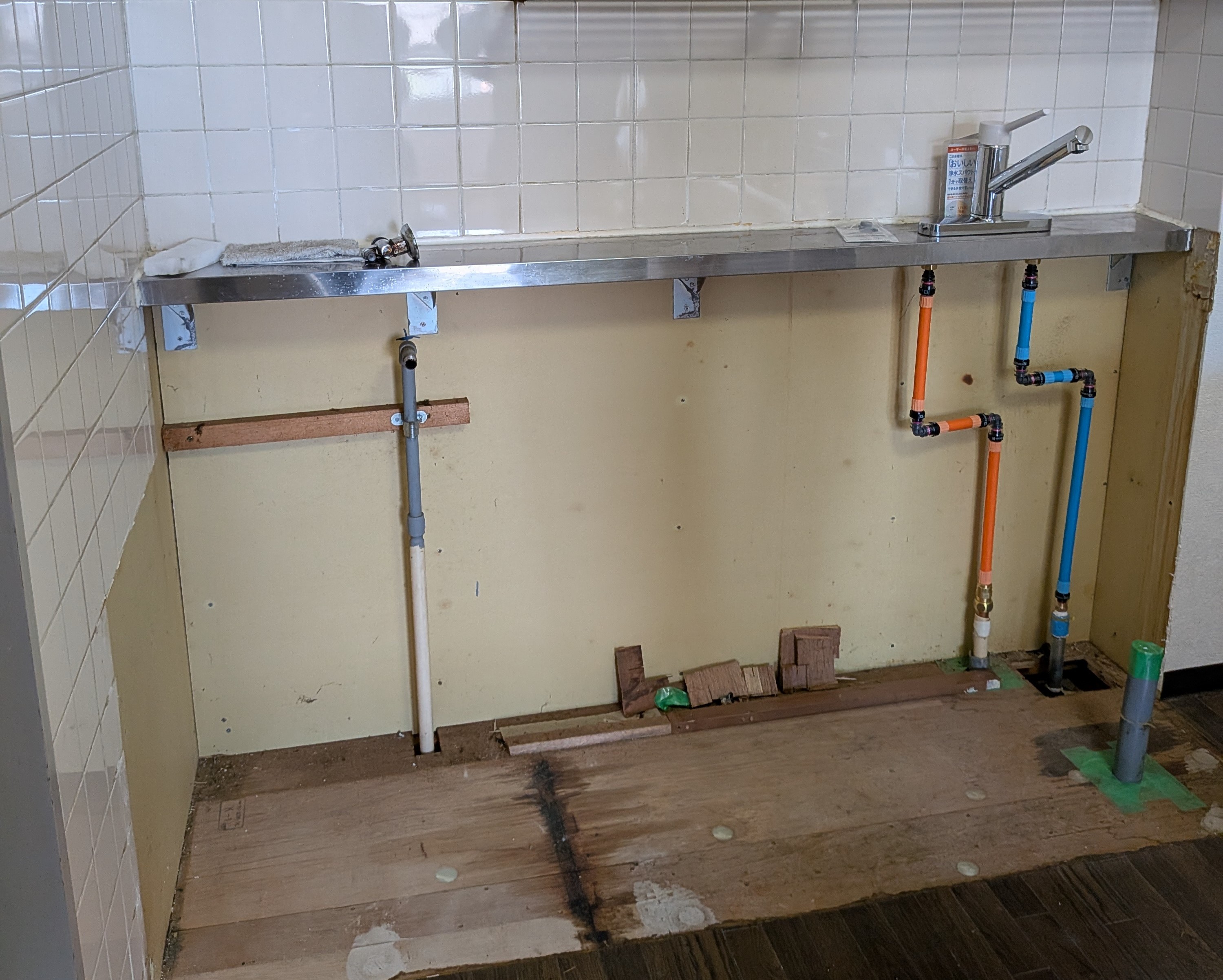 水洗金物も新品に交換したので、新しい流し台とガス台を設置していきます。